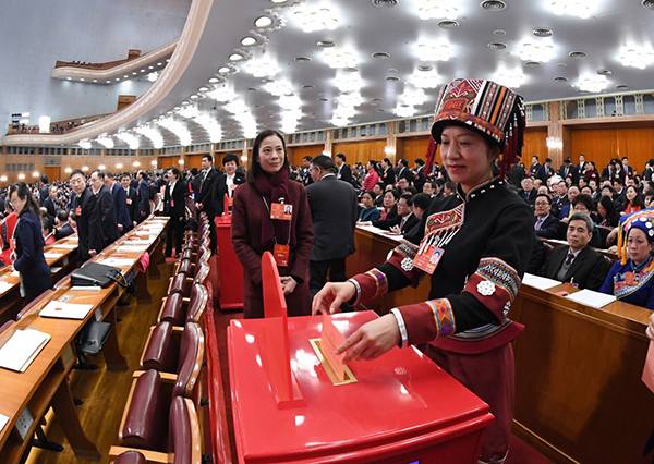 3月11日,十三届全国人大一次会议在北京人民大会堂举行第三次全体会议。这是代表投票表决中华人民共和国宪法修正案草案。新华社记者 饶爱民 摄