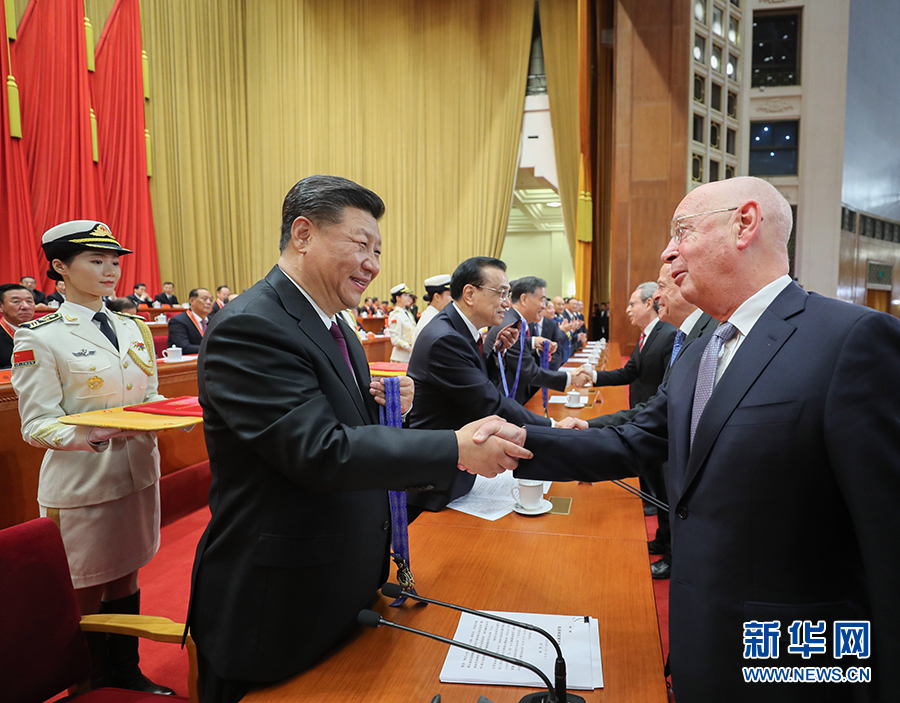 12月18日,庆祝改革开放40周年大会在北京人民大会堂隆重举行。中共中央总书记、国家主席、中央军委主席习近平在大会上发表重要讲话。这是习近平等为获得中国改革友谊奖章人员代表颁奖。 新华社记者 鞠鹏 摄