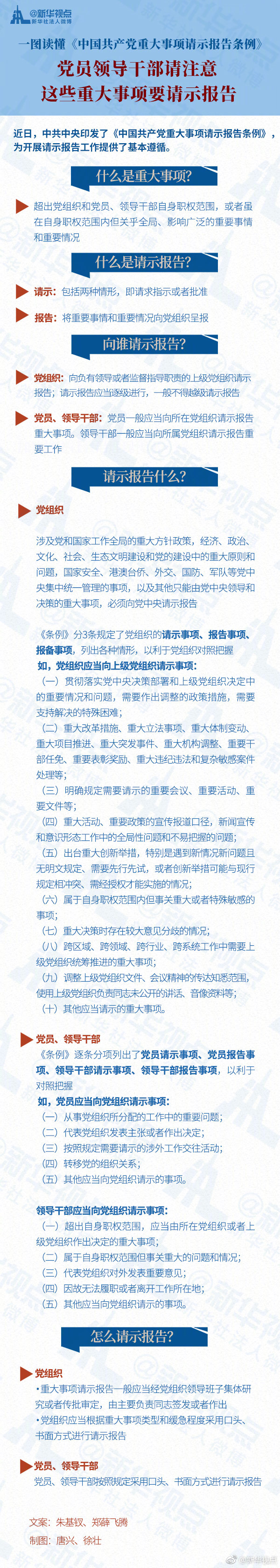 28日,中共中央印发的《中国共产党重大事项请示报告条例》全文公布,为开展党内请示报告工作提供了基本遵循。党组织、党员、领导干部的哪些事项需要请示报告?向谁请示报告?怎么请示报告?一图读懂