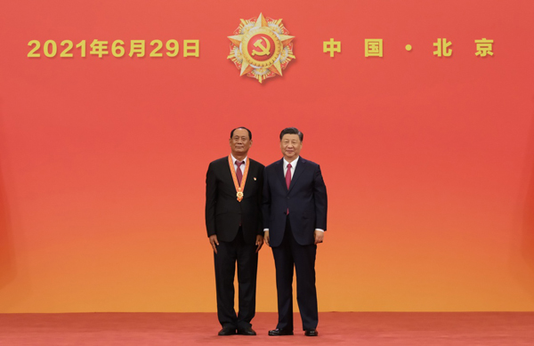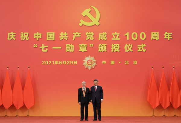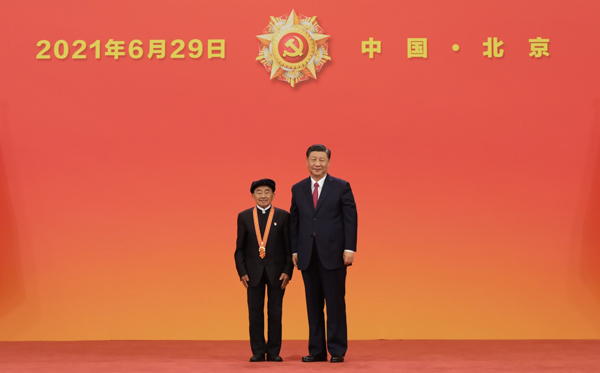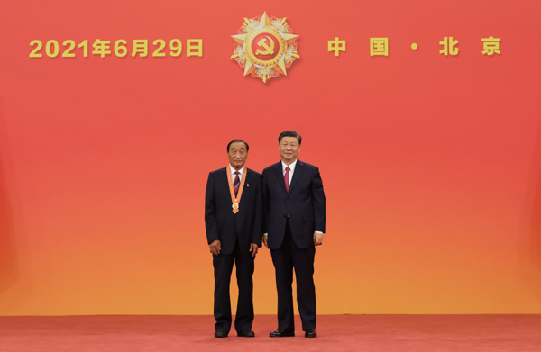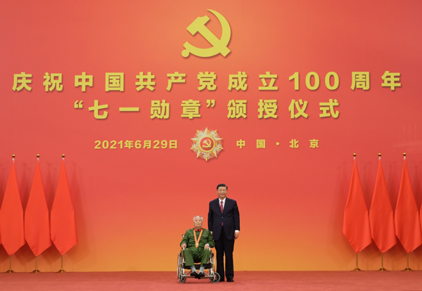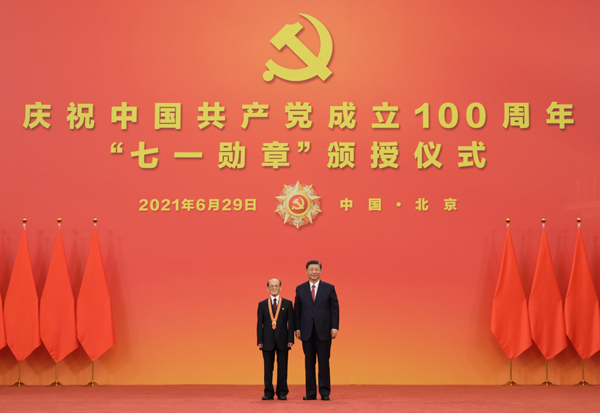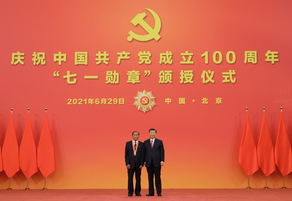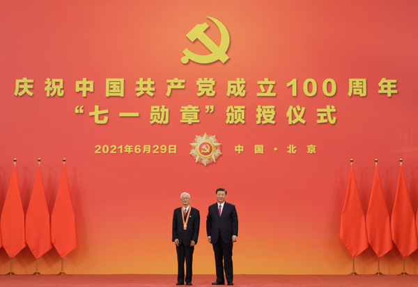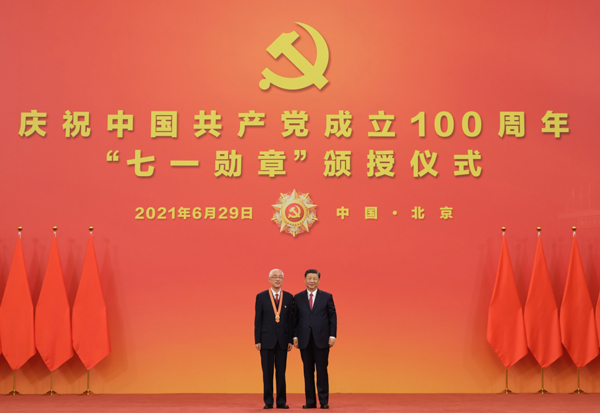 6月29日,庆祝中国共产党成立100周年“七一勋章”颁授仪式在北京人民大会堂金色大厅隆重举行。中共中央总书记、国家主席、中央军委主席习近平向“七一勋章”获得者崔道植颁授勋章。新华社记者 李学仁 摄