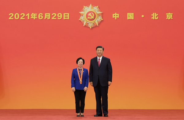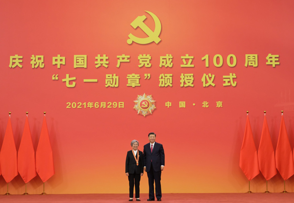 6月29日,庆祝中国共产党成立100周年“七一勋章”颁授仪式在北京人民大会堂金色大厅隆重举行。中共中央总书记、国家主席、中央军委主席习近平向“七一勋章”获得者黄宝妹颁授勋章。新华社记者 李学仁 摄