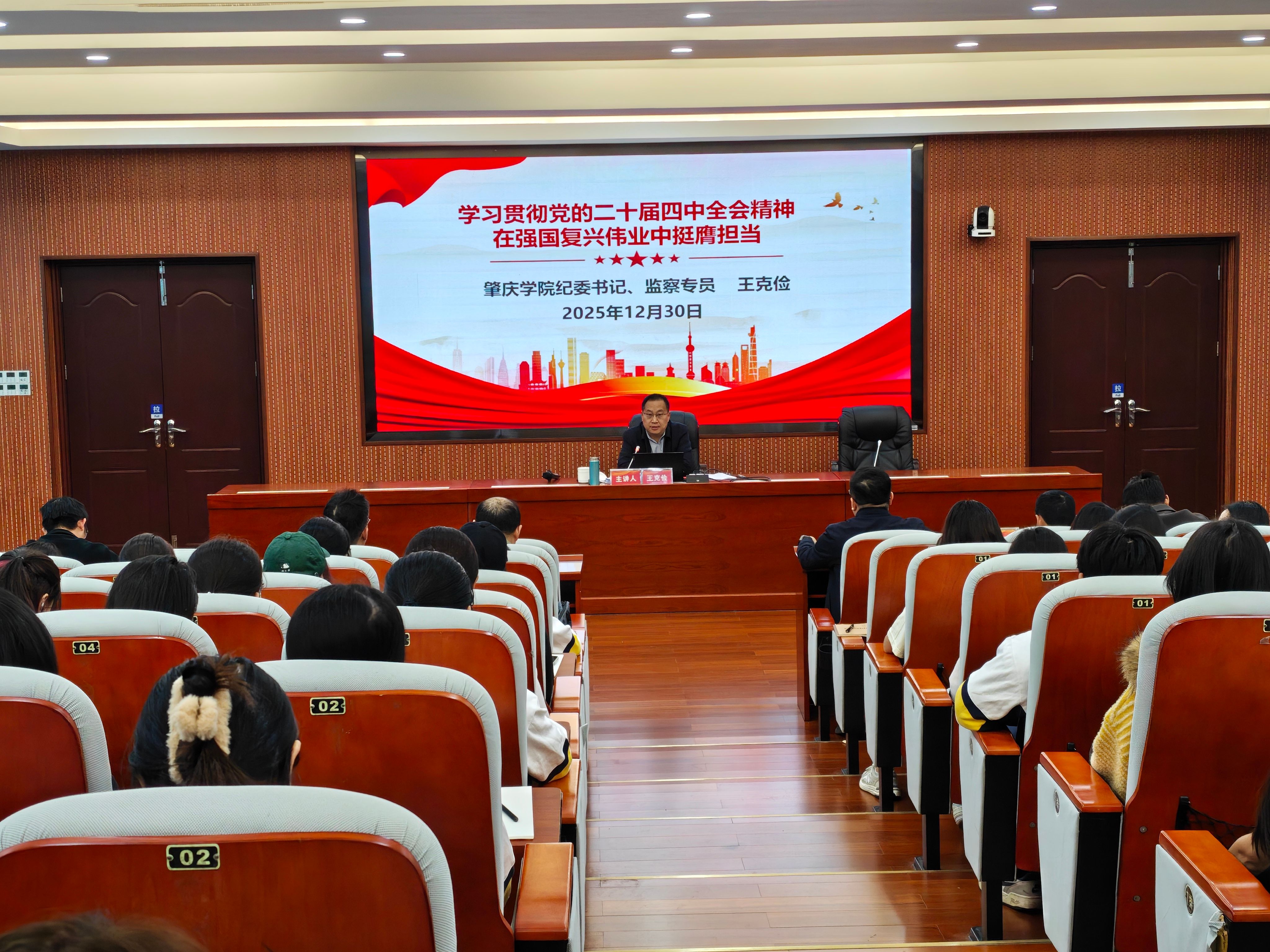 为深入学习贯彻党的二十届四中全会精神,切实把思想和行动统一到党中央决策部署上来,12月30日,学校纪委书记、监察专员王克俭以“学习贯彻党的二十届四中全会精神 在强国复兴伟业中挺膺担当”为主题,为分管的部门和联系的二级学院讲授专题党课。纪检监察室、经济与管理学院、生命科学学院、食品与制药工程学院等单位党员领导干部和师生代表约150人参加。食品与制药工程学院党委书记林晓忠主持党课。