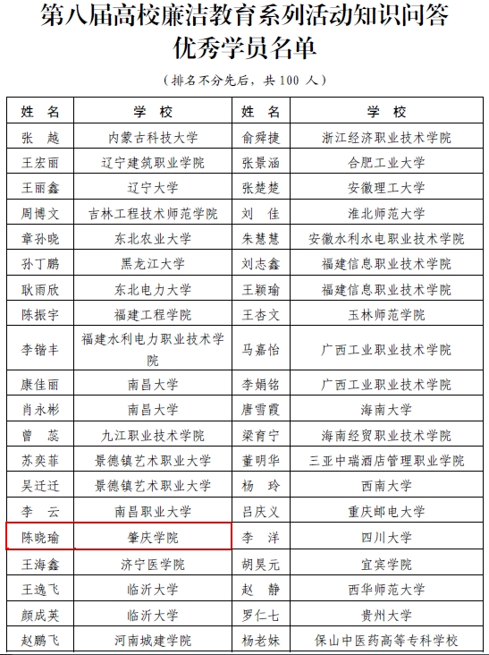 近日,教育部第八届高校廉洁教育系列活动评选结果揭晓。我校荣获2个奖项,《走好人生每一步棋》获得“润心话语”视频征集优秀作品,教育科学学院2022级应用心理学1班陈晓瑜同学获得知识问答“优秀学员”称号。