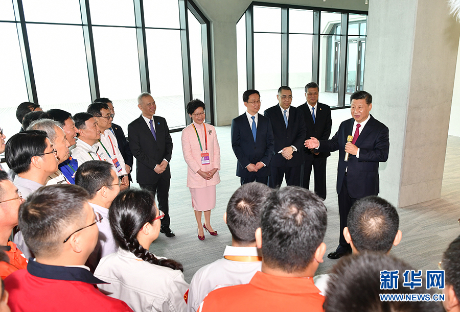 10月23日上午,港珠澳大桥开通仪式在广东省珠海市举行。中共中央总书记、国家主席、中央军委主席习近平出席仪式,宣布大桥正式开通并巡览大桥。这是习近平会见大桥管理和施工等方面的代表,同他们亲切交谈。 新华社记者殷博古 摄