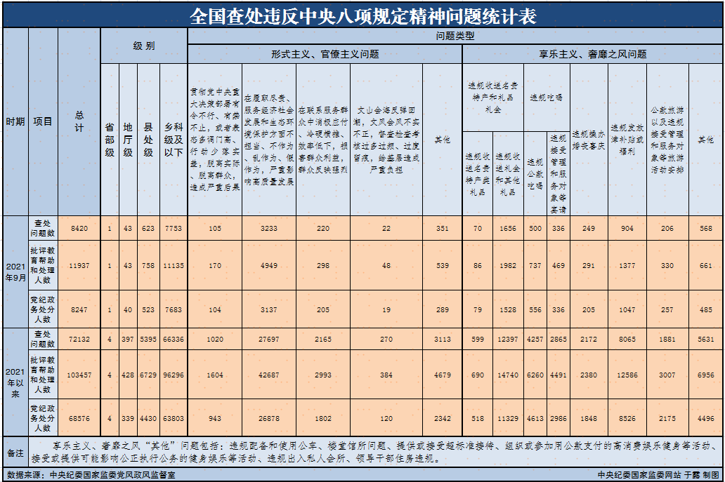 据中央纪委国家监委网站消息:2021年9月全国查处违反中央八项规定精神问题8420起。
