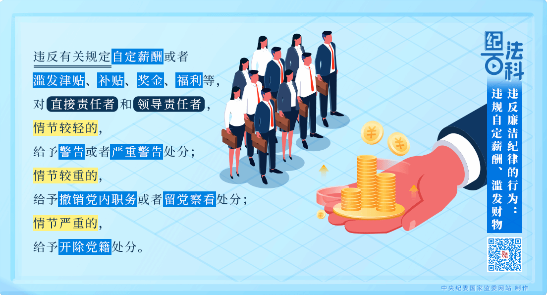 《中国共产党纪律处分条例》第一百一十四条规定:违反有关规定自定薪酬或者滥发津贴、补贴、奖金、福利等,对直接责任者和领导责任者,情节较轻的,给予警告或者严重警告处分;情节较重的,给予撤销党内职务或者留党察看处分;情节严重的,给予开除党籍处分。