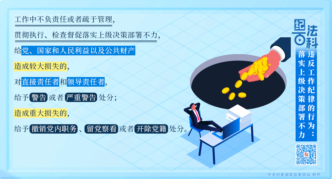 《中国共产党纪律处分条例》第一百三十条、第一百三十一条对工作失职失责行为列出负面清单,明确处分规定。第一百三十条第一款规定,工作中不负责任或者疏于管理,贯彻执行、检查督促落实上级决策部署不力,给党、国家和人民利益以及公共财产造成较大损失的,对直接责任者和领导责任者,给予警告或者严重警告处分;造成重大损失的,给予撤销党内职务、留党察看或者开除党籍处分。