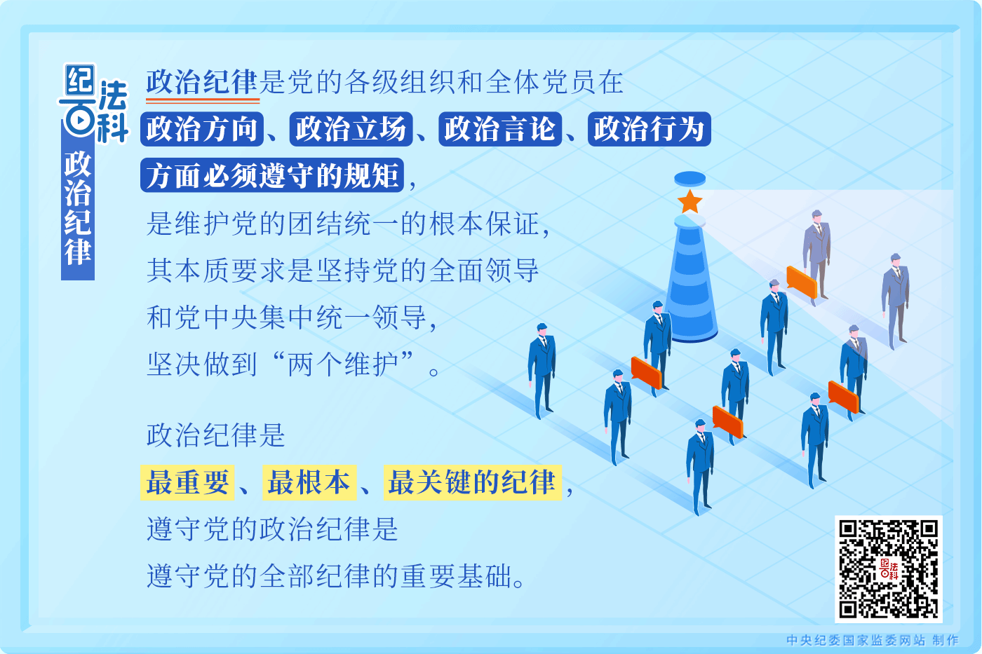 政治纪律是党的各级组织和全体党员在政治方向、政治立场、政治言论、政治行为方面必须遵守的规矩,是维护党的团结统一的根本保证,其本质要求是坚持党的全面领导和党中央集中统一领导,坚决做到“两个维护”。